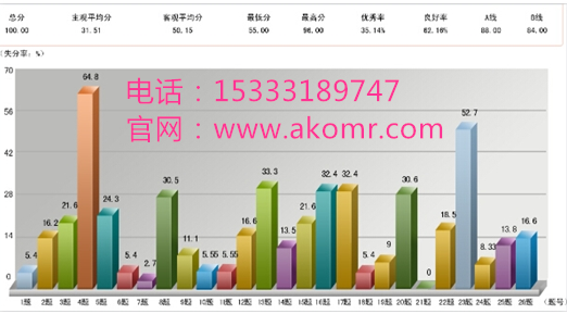 題目得分統計分析:對任意小題或任意小題組成的題組進行得分分析,高分、低分、平均分,標準差,難度,區分度,分數分布(也可得出指定分數段的分數分布),從而達到較好的題目分析結果。